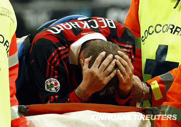 貝克漢姆痛苦的被擔架抬出賽場。新華社/路透
