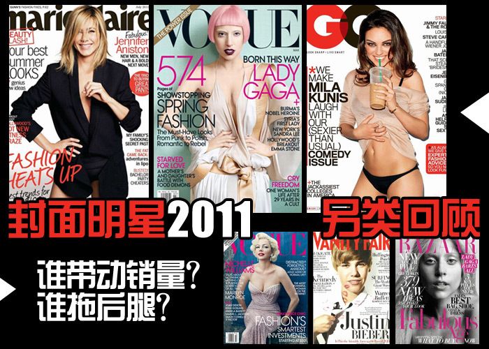 國外知名網站對2011年時尚雜志封面做了一番統計比較,其中賈斯汀 比伯、賈斯汀汀布萊克分別成發行量毒藥,人氣高漲的比寶雖先后登上了Rolling Stone、Teen Vogue以及People雜志封面,銷量均十分低落,他的《名利場》封面更是創造了自1992年以來該雜志的最低發行量。《欲望都市》女主角莎拉杰西卡 帕克跟甜心美人詹妮弗 安妮斯頓拿下了多個封面并且表現不俗,金 卡戴珊三姐妹與Lady Gaga則好壞參半。
