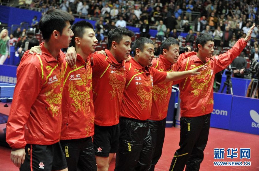 選手和教練在獲勝后向觀眾致意。當日,在德國多特蒙德進行的第51屆世界乒乓球團體錦標賽決賽中,中國男隊以3比0戰勝德國隊,奪得冠軍。 新華社記者馬寧攝