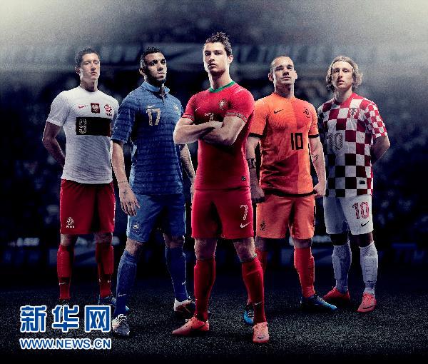 4月16日,克羅地亞、法國、荷蘭、波蘭、葡萄牙等5支歐洲足球勁旅的新款隊服公開亮相。這些隊服是耐克公司專為今年6月舉行的歐洲足球錦標賽量身打造的。圖為波蘭球員萊萬多夫斯基、法國球員姆維拉、葡萄牙球員克里斯蒂亞諾·羅納爾多、荷蘭球員斯內德和克羅地亞球員莫德里奇(從左至右)身穿本國國家隊新款球衣的照片。新華社發