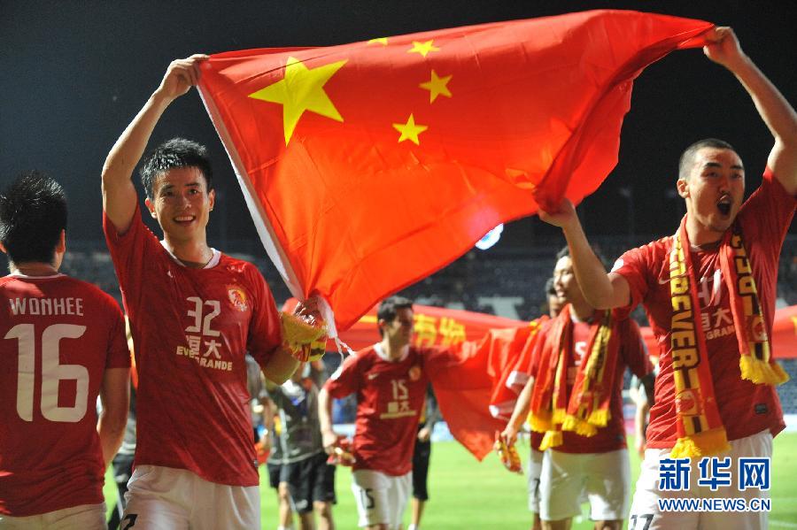 5月15日,廣州恒大隊(duì)球員孫祥(左)、趙旭日手舉國(guó)旗慶祝勝利。當(dāng)日,在亞冠聯(lián)賽小組賽最后一輪比賽中,廣州恒大隊(duì)客場(chǎng)以2比1戰(zhàn)勝泰國(guó)武里南聯(lián)隊(duì),晉級(jí)亞冠聯(lián)賽16強(qiáng)。 新華社發(fā)(拉亨攝)