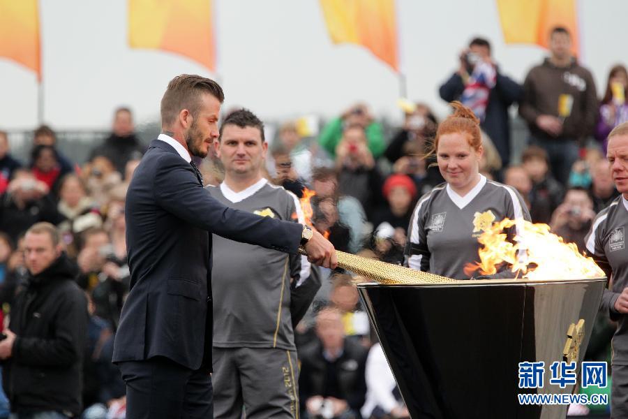 5月18日,在英國康沃爾德卡爾德羅斯皇家海軍航空站,英國足球巨星貝克漢姆(左一)用圣火引燃的火炬點燃了安放在飛機跑道上的一個圣火盆。當天,倫敦奧運圣火搭乘英國航空公司BA2012金色專機“螢火蟲”號抵達英國。19日清晨,為期70天,長達8000英里的接力將要展開。新華社發(倫敦奧組委供圖)