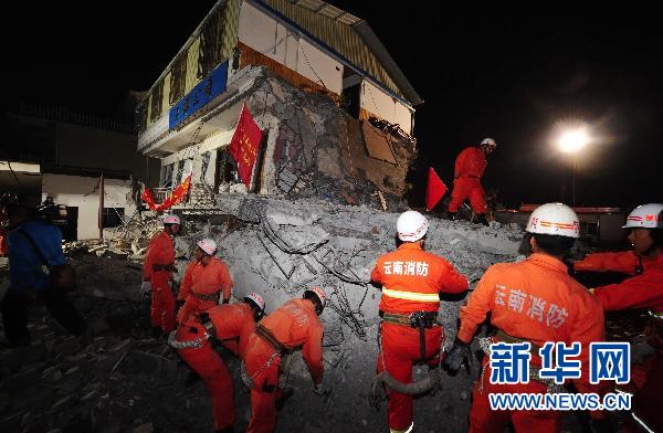 3月11日凌晨,消防官兵在云南盈江地震災(zāi)區(qū)搜救幸存者。 3月10日,云南省盈江縣發(fā)生5.8級地震。截至11日零時(shí),地震已致25人死亡,包括4名學(xué)生,250余人受傷。云南省救災(zāi)工作組及各救援隊(duì)已抵達(dá)災(zāi)區(qū),各項(xiàng)救災(zāi)工作正有序展開。新華社記者 秦晴攝