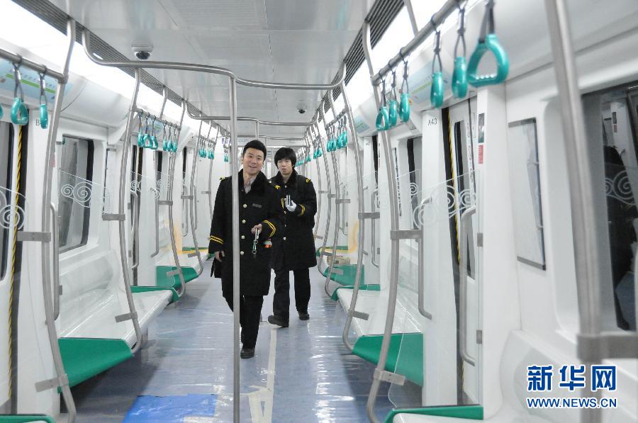 12月8日,兩名列車乘務人員在北京地鐵9號線空載試運行列車上。