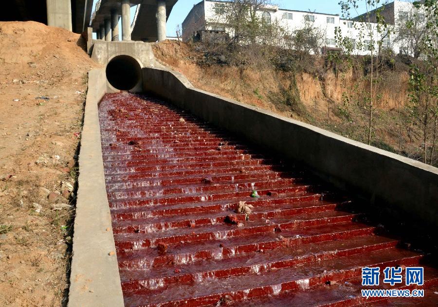 澗河岸邊一條排水明渠被染成了紅色,仍有少量廢水排入河道(12月15日攝)。近幾日,一條“洛陽驚現(xiàn)‘紅河谷’”的消息引起社會各界廣泛關注。新華社記者趕赴洛陽采訪了解到,當?shù)丨h(huán)保部門已找到排放“紅水”的源頭,并查出兩個非法生產窩點。雖然河水已經恢復原樣,但澗河兩岸的污染現(xiàn)象仍較嚴重,環(huán)保形勢不容樂觀。新華社記者王頌攝