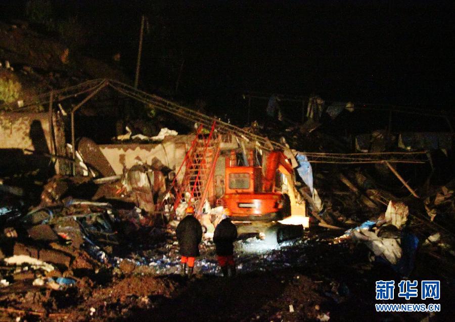 12月21日,四川省宜賓市筠連縣搶險救援人員在指揮挖掘機清理爆炸事件現場。 12月20日19時30分左右,四川省宜賓市筠連縣巡司鎮大地煤礦地面發生爆炸,導致一幢約1000平方米的3層樓房垮塌,造成4人死亡,12人住院治療,26人留院觀察。 新華社發(鄧良奎 攝)