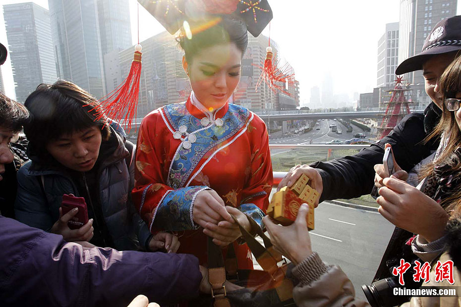 12月24日下午,上海浦東陸家嘴天橋上驚現一位身著清朝格格服飾的美貌女子,她手拉LV提包,胸前掛著一個“賣煙”的盒子,慷慨地向路人免費派送白銀,這樣的舉動讓現場的人們熱情高漲,瞬間引發眾人圍觀和哄搶。也有不少行人紛紛拿出相機、手機為遠道而來的“格格”拍攝,更有人要求與其合影留念,不過這位“格格”炫富的做法,很快受到當地巡邏城管的阻止。潘索菲 攝