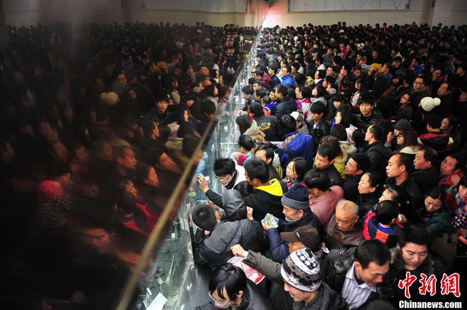 2011年12月28日,湖南省長沙市火車站售票大廳,前來買票的人們排起了長隊。當天是廣鐵春運火車票預售第一天,受互聯網售票、電話訂票和學生放假等因素的影響,湖南省長沙火車站迎來購票高峰。中新社發 郭立亮 攝