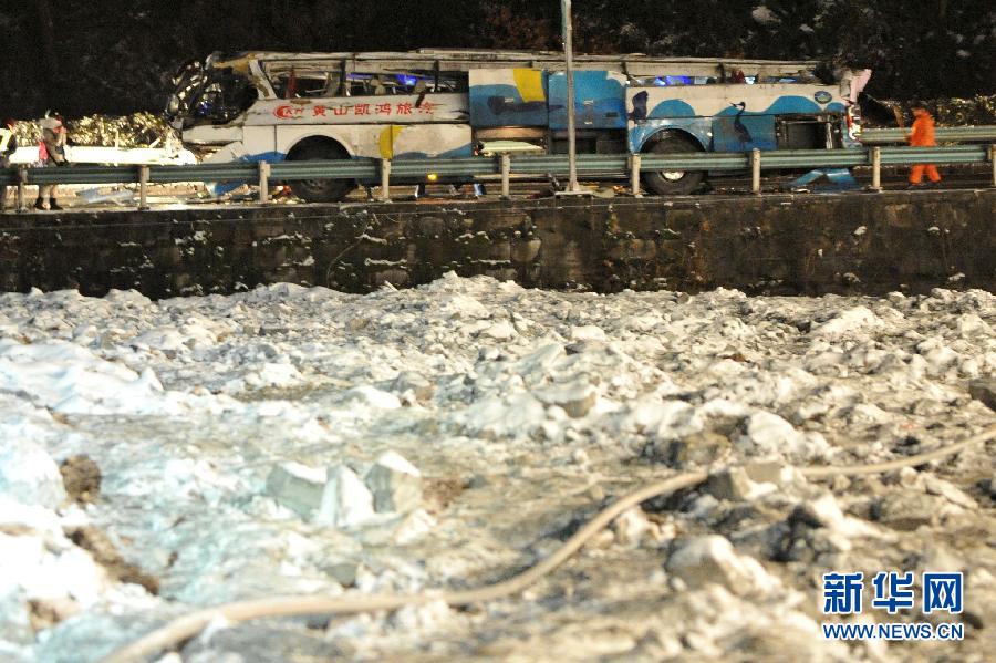 1月5日,事故車輛已經被吊起停放在路邊。蘭海高速貴州境內貴定縣到福泉市路段4日18時30分左右發生一起大客車翻車事故,至4日22時,現場救援工作基本結束,事故已造成16人死亡。新華社記者劉續攝