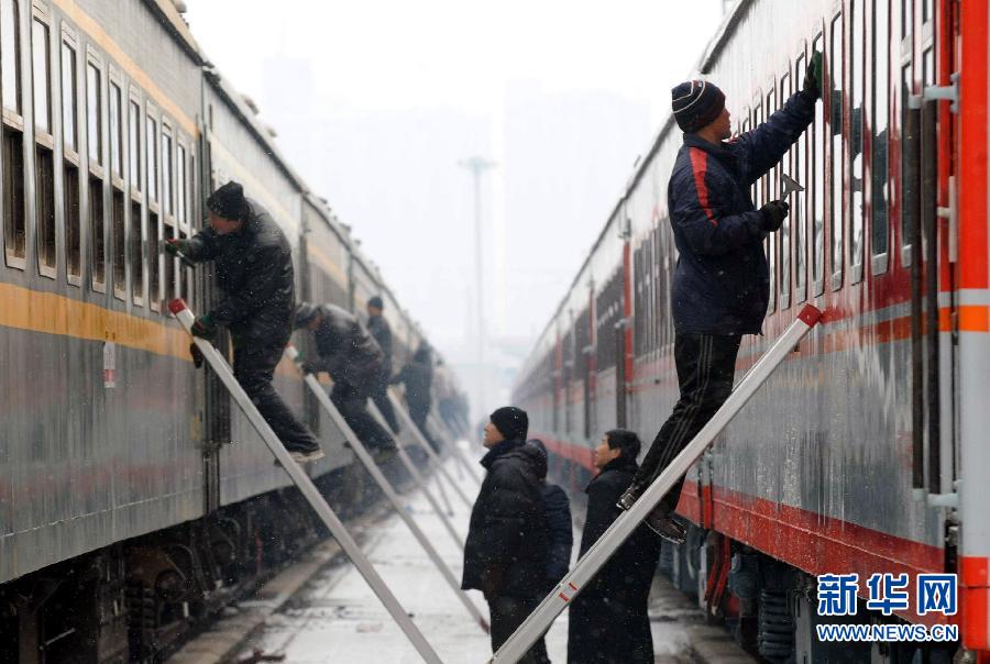 1月7日,北京客運段保潔車間人員在擦拭新增春運臨客列車的玻璃。 1月7日,北京鐵路局北京客運段上千名后勤人員開始投入到繁忙的春運工作中。他們除日常客運列車外,還將擔負新增的37列臨時客運列車的保潔、洗滌、供應、上煤、上水等工作。在臨時客運列車大量增加的情況下,他們將超負荷工作,用辛勤勞動保障春運一線旅客運輸順暢。新華社記者 唐召明 攝