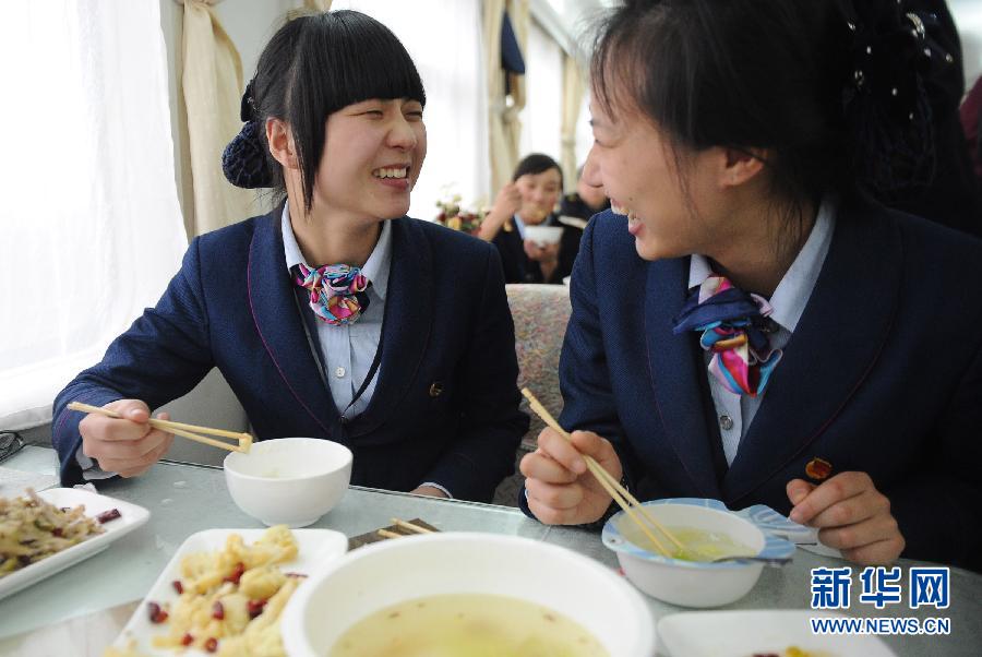 16時左右,在工作間隙,楊茜與其他乘務員列隊來到餐車吃午飯。之后,開始接下來的工作…… 這只是楊茜日常工作的一個片段。楊茜所在的班組每趟車跑下來要60個小時。“每次下班后從列車上下來,腳踩在地上感覺都是飄的。”楊茜說。 “春運開始后,明顯感覺人多了,這對我們的服務提出了更高的要求。我們不僅要像平時一樣做好服務工作,還要更細致。”楊茜向記者談起自己的春運感受。新華社記者李健攝