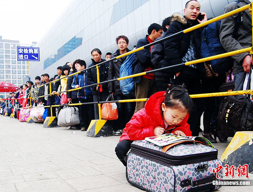 龍年新春臨近,越來越多在重慶打工的異鄉人帶著家人返鄉。圖為重慶火車北站廣場上,一名小女孩趁父母排隊購票的時間,抓緊學習。中新社發 陳超 攝