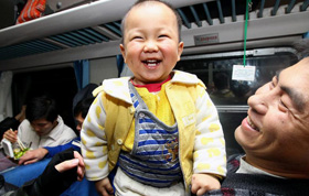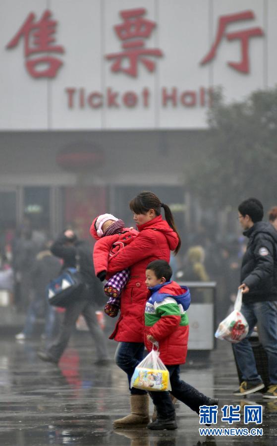 1月18日,一位旅客帶著孩子冒著小雨準(zhǔn)備搭乘返鄉(xiāng)的列車。自2012年春運(yùn)大幕開啟以來,鄭州首次迎來雨天。當(dāng)日,在鄭州火車站廣場,乘客們冒著小雨搭乘返鄉(xiāng)的列車。 新華社發(fā)(李博 攝)