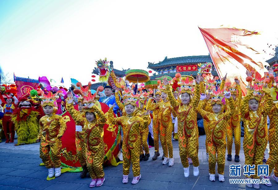 1月22日,開幕式的演員一齊給大家拜年。當日,第二十九屆龍潭春節文化廟會開幕式在北京龍潭公園主會場舉行。河北龍獅舞、滿族秧歌、朝鮮族象帽舞等節目火熱開場,歡騰熱鬧的氣氛迅速點燃了全場觀眾的熱情。本屆龍潭春節文化廟將持續到1月29日(農歷正月初七)。新華社記者 張宇 攝