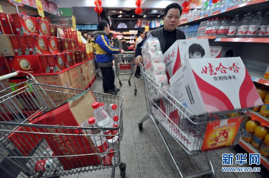1月25日,人們在廣西柳州一超市內搶購瓶裝飲用水。 日前,廣西河池宜州市境內的龍江河發生鎘濃度超標事件,受此影響,1月24日晚間至25日,下游廣西柳州市的多個超市發生搶購瓶裝飲用水事件。據柳州水情部門監測,目前,柳江干流水質安全。 新華社發