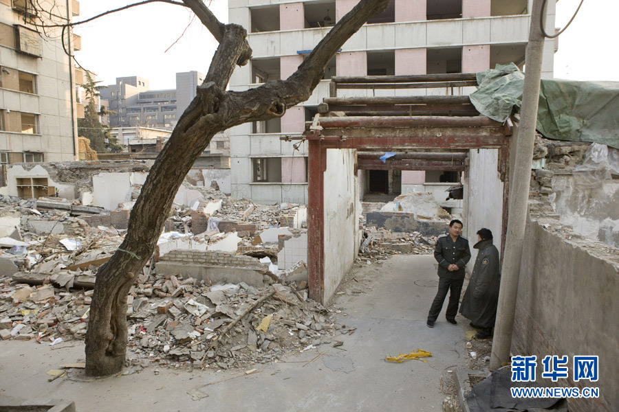 1月27日,保安在梁思成、林徽因故居殘破的門樓旁聊天。
