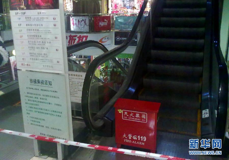 昨日下午,記者趕到西單新一代商城時發現,商城東側四層至六層的上行扶梯已停運,扶梯入口處拉起了警戒線,兩名工作人員看守在商城五層的扶梯入口處,五層上六層的扶梯左側能依稀看到干了的血跡。