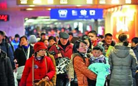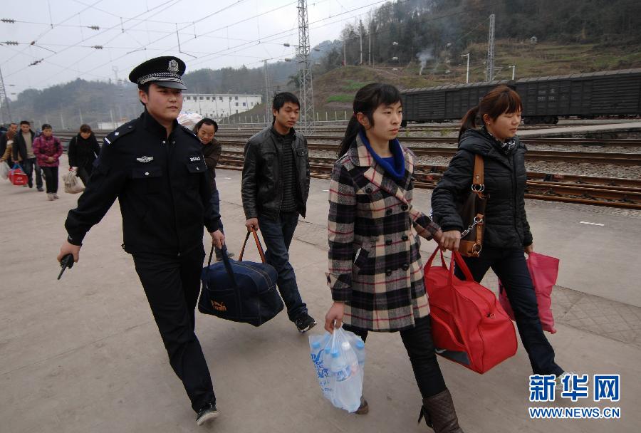 1月31日,鐵警在宣漢車站幫旅客提行李進站乘車。當日是正月初九,由四川宣漢始發的L136次農民工專列載著2000余名乘客開往廣州,西安鐵路公安局安康公安處組織大量警力在始發站投入安全保衛工作,并為外出務工人員宣講安全乘車、防盜防騙知識。新華社記者 李一博 攝