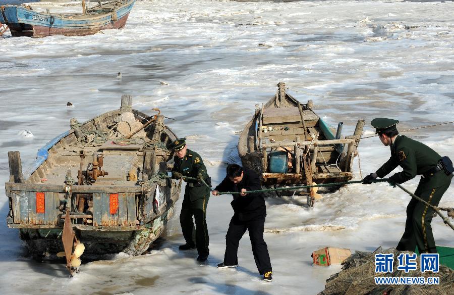 2月2日,青島紅石崖邊防派出所干警在幫助大殷社區漁民加固船纜,防止船纜被海冰撐開造成滑纜。新華社記者李紫恒攝