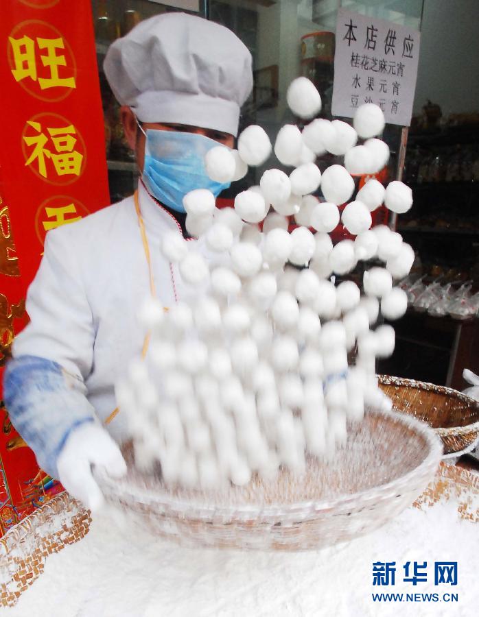 元宵節將至,江西九江市多家食品店忙著用手工傳統工藝趕制元宵。工作人員將各種口味的餡料放到撒滿糯米粉的竹篩里,然后反復進行搖勻和過水,最終制成手工傳統的搖元宵,受到消費者的青睞。新華社發(胡國林 攝)