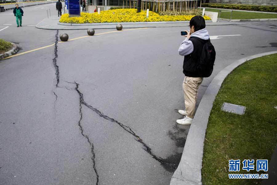 2012年2月16日,上海陸家嘴環球金融中心前,一記者在拍攝地面裂痕。當日微薄報料稱,環球金融中心與在建的上海中心間地面發生裂縫,地形上下錯開。據在現場測量的上海建工工作人員介紹,這幾道裂痕出現已經有段時間了。