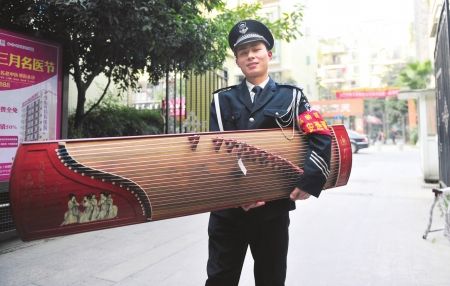 保安哥叫陳紅,遂寧人,身高1.7米左右,長相清秀,是個靦腆的小伙子,在小區里當保安一年多了。他說,平日里空閑的時間比較多,彈古箏是為了修煉自己浮躁的心情,凈化心靈。總比喝茶、打牌來打發時間好。