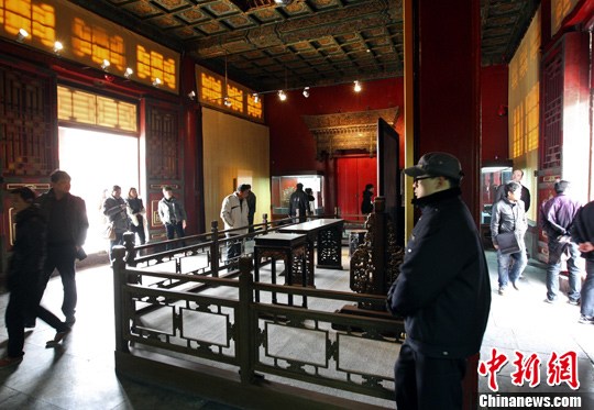 3月22日,游客在北京故宮參觀由香港兩依藏博物館提供的《交融——兩依藏珍選粹展》,安保人員(右)在館內(nèi)巡視。中新社記者 張浩 攝