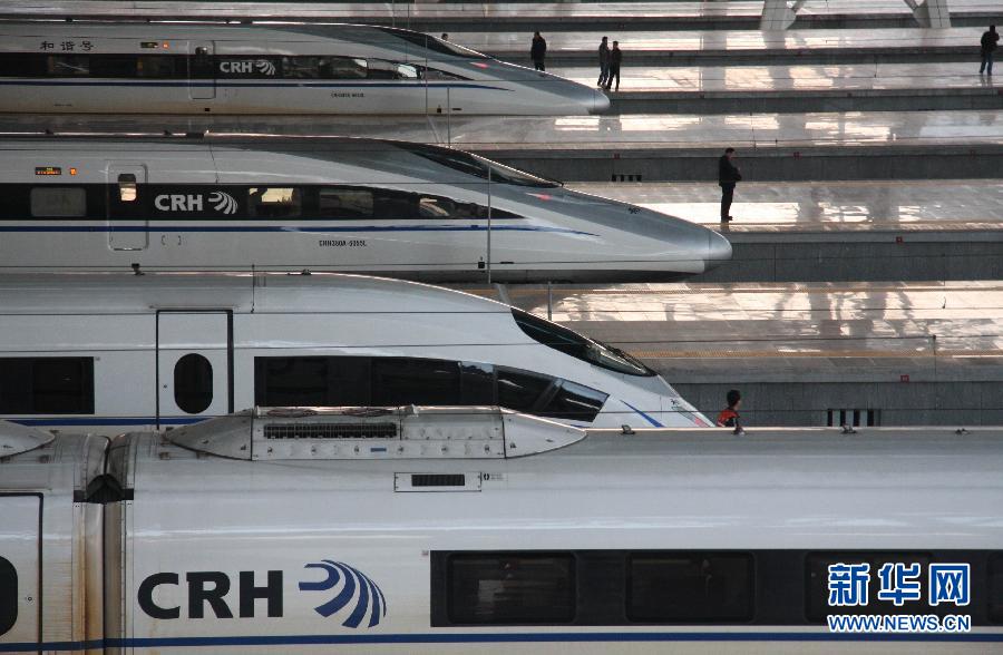 3月23日下午拍攝的停滯在北京南站的動車組列車。當日,北京遭遇入春以來最強風,郊區部分地區陣風近十級。受其影響,京滬高鐵多輛動車延誤或停運。新華社發(傅新春 攝)