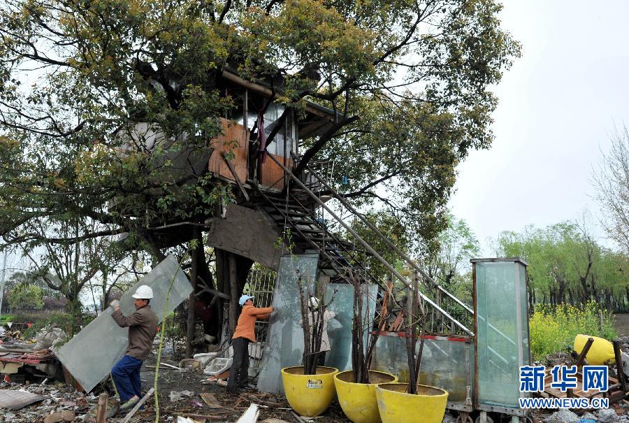 4月13日,工人在拆除“樹屋”。當(dāng)日,上海浦東新區(qū)金橋鎮(zhèn)一座14平方米的“樹屋”因?qū)龠`章搭建,被正式拆除。據(jù)“樹屋”主人、66歲的黃崇高介紹,這是2005年建在一棵香樟樹上的小木屋,其中有床、衛(wèi)生間、浴缸、電視機、音響等,屋頂還有一根避雷針,造價約8000元。新華社發(fā)(鈕一新 攝)