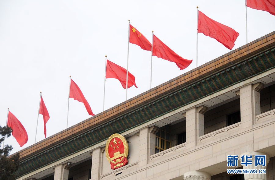 3月2日,人民大會(huì)堂上方布置的紅旗迎風(fēng)飄揚(yáng),喜迎2013年全國兩會(huì)的召開。新華網(wǎng) 翟子赫攝