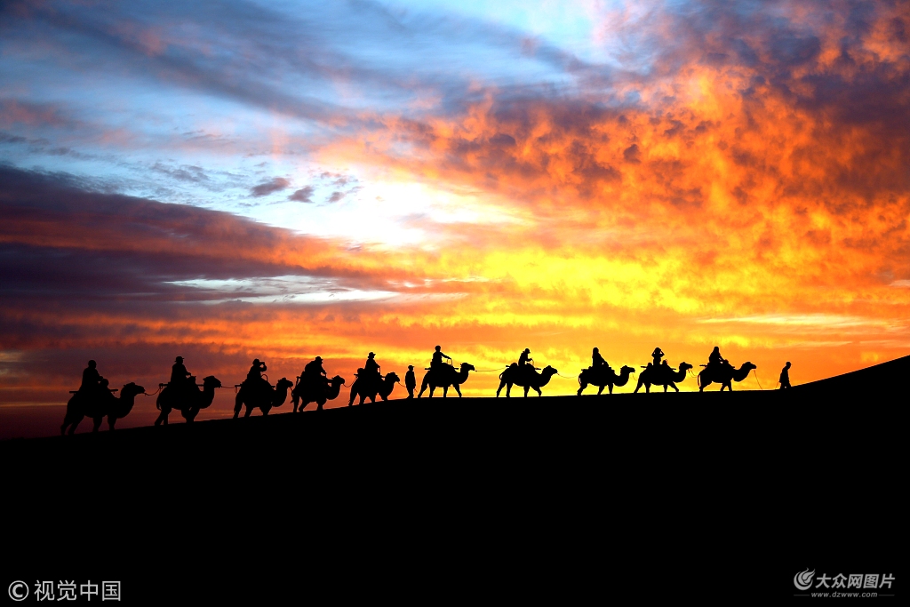 2018年8月19日,游客在甘肅省敦煌市鳴沙山月牙泉景區欣賞大漠風光。圖片作者:張曉亮/視覺中國