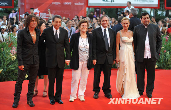 9月2日,在意大利威尼斯利多島,本屆威尼斯電影節(jié)競賽單元評委會成員(左起)意大利導(dǎo)演盧恰諾·利加布埃、華人導(dǎo)演李安、意大利導(dǎo)演利利亞娜·卡瓦尼、美國導(dǎo)演喬·丹特、法國演員桑德里娜·博奈爾和印度導(dǎo)演阿努拉格·卡什亞普亮相開幕式紅地毯。當天傍晚,第66屆威尼斯電影節(jié)在水城威尼斯的利多島開幕。新華社記者武巍攝