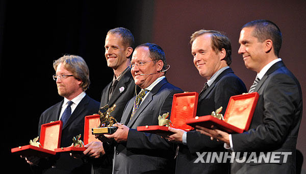 9月6日,在意大利威尼斯利多島,(從左至右)《海底總動(dòng)員》導(dǎo)演安德魯·斯坦頓、《飛屋環(huán)游記》導(dǎo)演皮特·多克特、《玩具總動(dòng)員》系列影片前兩集的導(dǎo)演約翰·拉塞特、《料理鼠王》導(dǎo)演布拉德·伯德以及《玩具總動(dòng)員2》的導(dǎo)演之一李·昂克里奇展示獲得的第66屆威尼斯電影節(jié)“終身成就金獅獎(jiǎng)”。新華社記者武巍攝