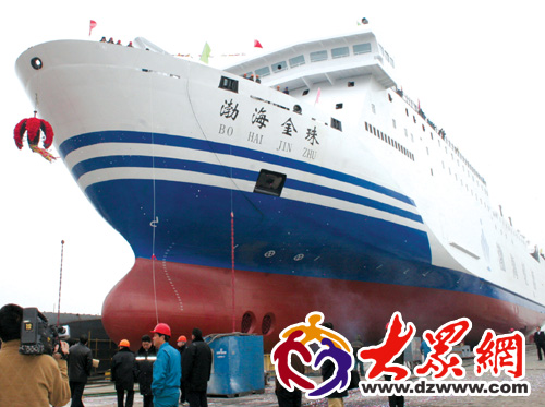 |  2月28日,我國自行設計建造的最大客滾輪“渤海金珠”號在石島順利下水。據介紹,“渤海金珠”輪總長161.2米,滿載排水量14000噸,可載客1160人,裝載長度15米的重型汽車120輛,可抗9級大風。6個月后,該輪將投入渤海灣黃金水道——煙臺至大連航線。 |