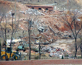 經山東省政府事故調查組確認,在4月1日的煙臺招遠七六一有限責任公司(炸藥廠)爆炸事故中,除2名工人受傷外,其余29名在崗職工全部遇難。 圖為事故現場。 新華社發 |