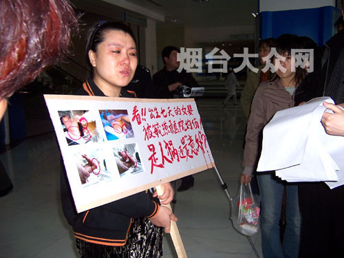 煙臺大眾網4月6訊(記者 馬敏 李培艷)5日下午1時30分,記者在煙臺毓璜頂醫院門診大廳里看到,一位女士正在舉著牌子向市民哭訴,牌子上寫著“看!!出生七天的女嬰被毓璜頂醫院灼傷!是人禍還是‘意外’?”。“你們看看,我的孩子讓他們燙成什么樣了,連皮都掉了,才出生七天啊……”另一名陪同在場的先生則拿著手里的照片分給圍觀的群眾。“真是可憐啊,這么小的孩子……”圍觀的人群中人們紛紛表示同情。