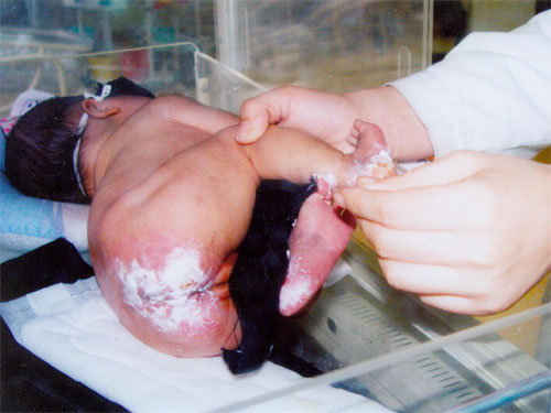 這位孫先生告訴記者,他和妻子都是煙臺本地人,妻子叫劉英杰,今年30歲,今年1月26日她在煙臺毓璜頂醫院順產生下一名女嬰,因嬰兒黃疸明顯,轉到該院小兒內科進行治療,1月31日又轉到小兒內科的加強治療中心里接受治療。由于醫院規定,在加強治療中心家長不得看護孩子,所以這期間一直由護士照顧。2月2日下午2時許,醫護人員突然通知說孩子出了點問題,讓他們到加強治療中心來一下。劉英杰說,當時她忐忑不安地來到加強治療中心見到女兒時,卻發現孩子雙腳腳后跟及臀部大面積地涂了一層白色藥膏,醫護人員當時解釋說是護士在給患兒洗澡時,因水溫高及接觸時間長等因素造成的燙傷。院方承認過錯,答應積極治療,并答應對當事人進行處理。