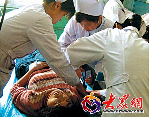 眾人抬著昏迷的女青年火速下山。醫護人員對女青年進行洗胃急救。