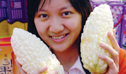 4月20日,參觀者手持臺灣出產的苦瓜。當日,第七屆中國(壽光)國際蔬菜科技博覽會在壽光開幕。博覽會上首次展出了來自臺灣云林、臺東等地的十余種時令優(yōu)質熱帶水果及數(shù)種臺灣蔬菜,其中包括國務院剛剛通過準入的山葵、絲瓜、苦瓜等。 新華社發(fā)