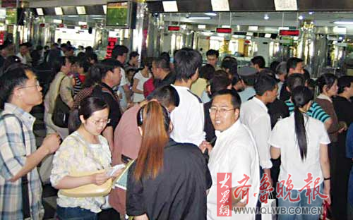 5月31日是房產新政實施之前的最后一天,為搭末班車辦理完過戶手續,早晨5點就有許多市民來到青島市房地產交易中心大門外等候,到8點,門外已黑壓壓地擠了兩三千人。當天,該中心二手房過戶量高達平常的十倍。 本報記者 劉大正 攝