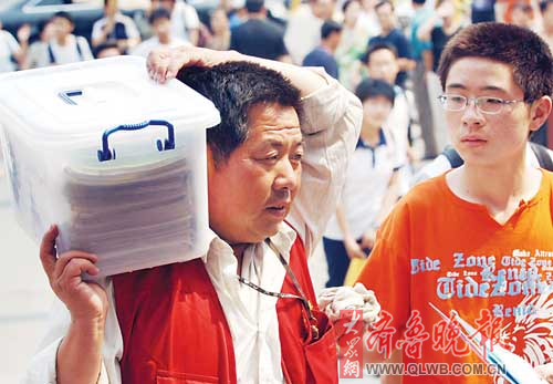 這位父親幫兒子扛了一大箱子書,送到考點門口。本報記者 劉軍 攝 本報濟南6月12日訊 12日下午中考的科目文科綜合是開卷考試,考生可以攜帶書本。為了考個好成績,有的考生動用拉桿箱、密碼箱甚至塑料大書箱把書搬到考場,成為中考的特別風景。 12日下午,記者在省實驗中學、濟南中學、回民中學等考點看到,考生們?nèi)雸鰰r都是大包小包齊上陣。在省實驗中學門口,一位王女士幫女兒提著3個手提袋,里面裝滿了政治、地理、歷史的教科書和輔導材料。王女士說,這還沒有帶全呢。這樣在考場上心里有點底。還有的考生甚至動用了拉桿箱和大大的密碼箱,里面裝的全是相關(guān)書籍。有的家長幫孩子把考試用書扛到了考場。 也有的家長并不這樣,來自匯文實驗中學的陳先生說,對于考生來說,工夫要下在平常,自己的女兒就是輕裝上陣。陳先生說,雖然是開卷考試,但是書帶多了,到時候翻書也未必來得及啊。