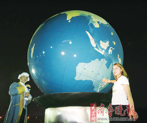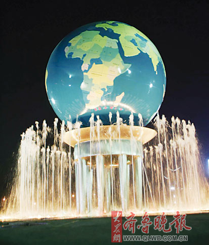 “水·地球”雕塑由直徑3米、可均勻旋轉的地球儀,代表世界五大洲的9條著名的河流模型,展示泉城風光的旅游櫥窗,以及噴泉、燈光、音響等系統組成。