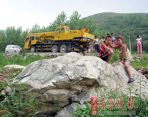 本報(bào)濟(jì)南7月11日訊 11日凌晨3時(shí)許,一輛小汽車和一輛大吊車,悄悄來到省城歷城區(qū)西營鎮(zhèn)上降甘村,想將路邊河溝里的一塊大石頭吊走。然而,剛把鋼絲繩捆上石頭,就被村民發(fā)現(xiàn),隨即報(bào)警稱有人偷他們村的“寶石”。 11日上午,記者來到西營鎮(zhèn)上降甘村,發(fā)現(xiàn)路邊上停放著一輛小轎車和一輛嶄新的大吊車,車旁邊圍滿了村民。 路邊的河溝里,有一塊長約3米、高約1米的大石頭,這塊石頭其他地方看上去與普通石頭沒有什么區(qū)別,其中一面的花紋像一條龍(左圖)。 村民說,曾經(jīng)有一位專門收購石頭的專家鑒定過,稱這塊石頭很有價(jià)值,曾經(jīng)有人出價(jià)30萬想買這塊石頭,但是他們沒有答應(yīng)。 村民李先生告訴記者,11日凌晨3時(shí)許,他們聽到外面大車經(jīng)過的聲音。比較警覺的近20名村民查看,發(fā)現(xiàn)路邊停著一輛小汽車和大吊車,5男1女6個(gè)人正把鋼絲繩捆綁在“寶石”上往外吊。村民隨后阻攔制止,天一亮就報(bào)了案。 記者在西營鎮(zhèn)派出所見到了被村民認(rèn)為是偷石頭的“老板”,但是她對(duì)偷運(yùn)石頭矢口否認(rèn)。目前,警方正在調(diào)查此事。 魯超國 攝 |