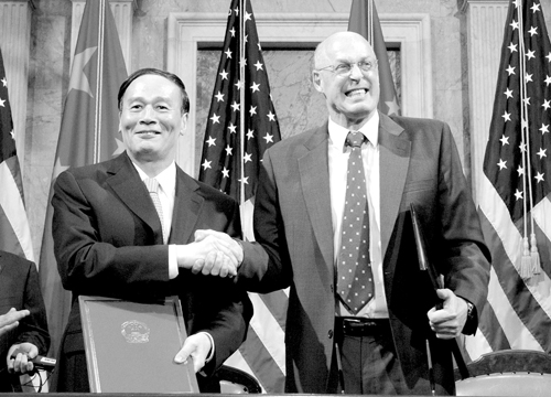 6月18日,中國國家主席胡錦濤的特別代表、國務院副總理王岐山和美國總統布什的特別代表、財政部長保爾森在美國財政部共同簽署了《中美能源環境十年合作框架》文件。這是王岐山和保爾森簽署《中美能源環境十年合作框架》文件后握手。□新華社發