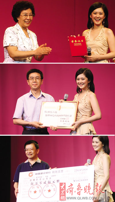 濟南市副市長張澤向張娜拉頒發“濟南慈善大使”榮譽證書。齊魯晚報·生活日報總編輯郝克遠向張娜拉頒發“榮譽記者”證書。齊魯晚報·生活日報總經理梁洪文向張娜拉轉交兩報捐贈的5萬多元善款。