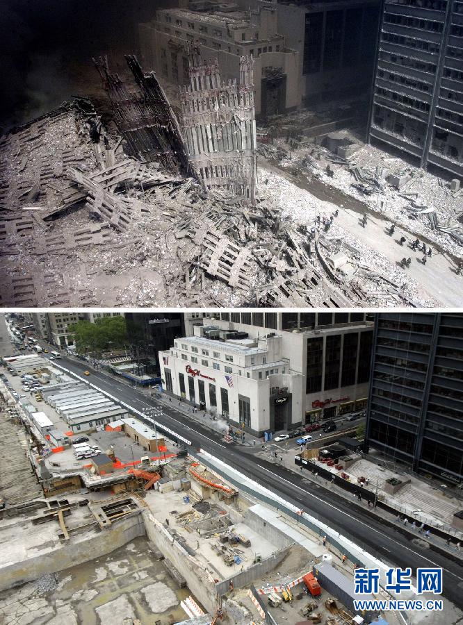 “零地帶”一詞先前被用于形容核爆炸區(qū)域,后用于描述極端和暴力事件發(fā)生地。2001年9月11日,恐怖分子劫持4架客機(jī),操縱其中兩架撞入世貿(mào)中心雙塔,致死大約3000人。該地也因此被稱為“零地帶”。十年前的“9·11”,這里是人間地獄,十年后的今日,這里正在重建。紐約市長(zhǎng)邁克爾·布隆伯格說(shuō):“我們永遠(yuǎn)不會(huì)忘記這片被稱作‘零地帶’的區(qū)域遭受的破壞,永遠(yuǎn)不會(huì)。不過(guò),是時(shí)候把這片16英畝(約合6.5公頃)的區(qū)域稱作‘世貿(mào)中心和國(guó)家9·11紀(jì)念館’了。”“9·11”恐怖襲擊以來(lái),紐約在遭受重創(chuàng)的曼哈頓下城區(qū)域投資5.52億美元,興建公園、街道等市政設(shè)施并整修下水管道。數(shù)座全新摩天大樓將在世貿(mào)中心遺址拔地而起,而遺址區(qū)域地標(biāo)建筑“9·11”紀(jì)念館定于恐怖襲擊十周年之日對(duì)遇難者家屬開(kāi)放,次日向公眾全面開(kāi)放。這是“9·11”事件發(fā)生近9個(gè)月后,遭受毀滅性襲擊的美國(guó)紐約世貿(mào)中心已經(jīng)從一片廢墟(上圖,攝于2001年9月11日)變成一個(gè)新的建筑工地(下圖,攝于2002年6月4日)。新華社發(fā)(程麗編輯)