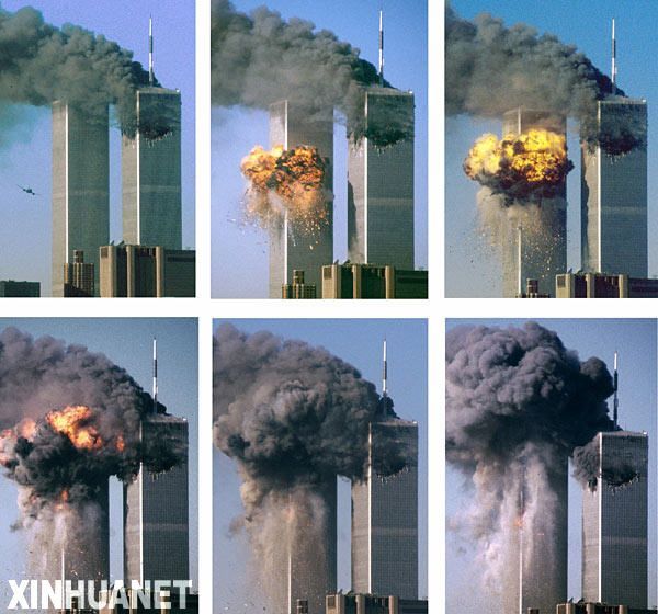 2001年9月11日,恐怖分子劫持了美國4架民航客機,其中兩架撞坍了紐約世貿中心“雙子大廈”,一架撞毀華盛頓五角大樓的一角,另一架墜毀。這一系列襲擊導致3000多人死亡,并造成數千億美元的直接和間接經濟損失。這是一架飛機撞擊紐約世貿中心“雙子大廈”南樓的拼版照片(2001年9月11日攝)。新華社發(fā)