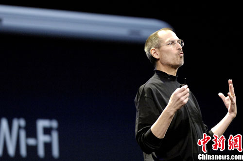 圖為2008年1月喬布斯在舊金山推出蘋果新產(chǎn)品時的檔案照片。中新社發(fā) 陳鋼 攝