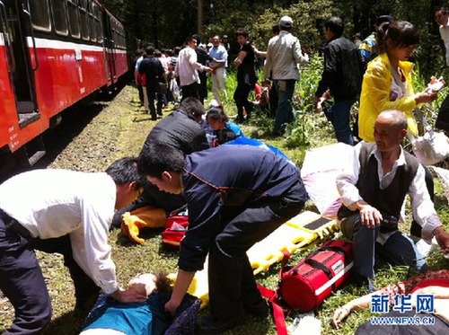 4月27日,救援人員在臺灣阿里山小火車翻車事故現場實施救援。新華社發