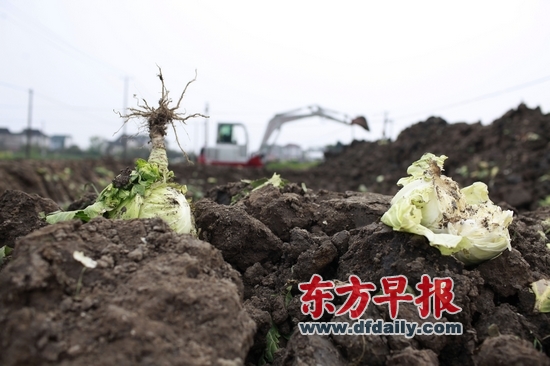 人們甚至已經動用過拖拉機,來碾碎多余的卷心菜。昨天下午,在馬路另一側的卷心菜地,一輛工程鏟車正將靠近路邊的田深挖。在刨開的泥土里,能清楚地看到一棵棵完整的卷心菜。